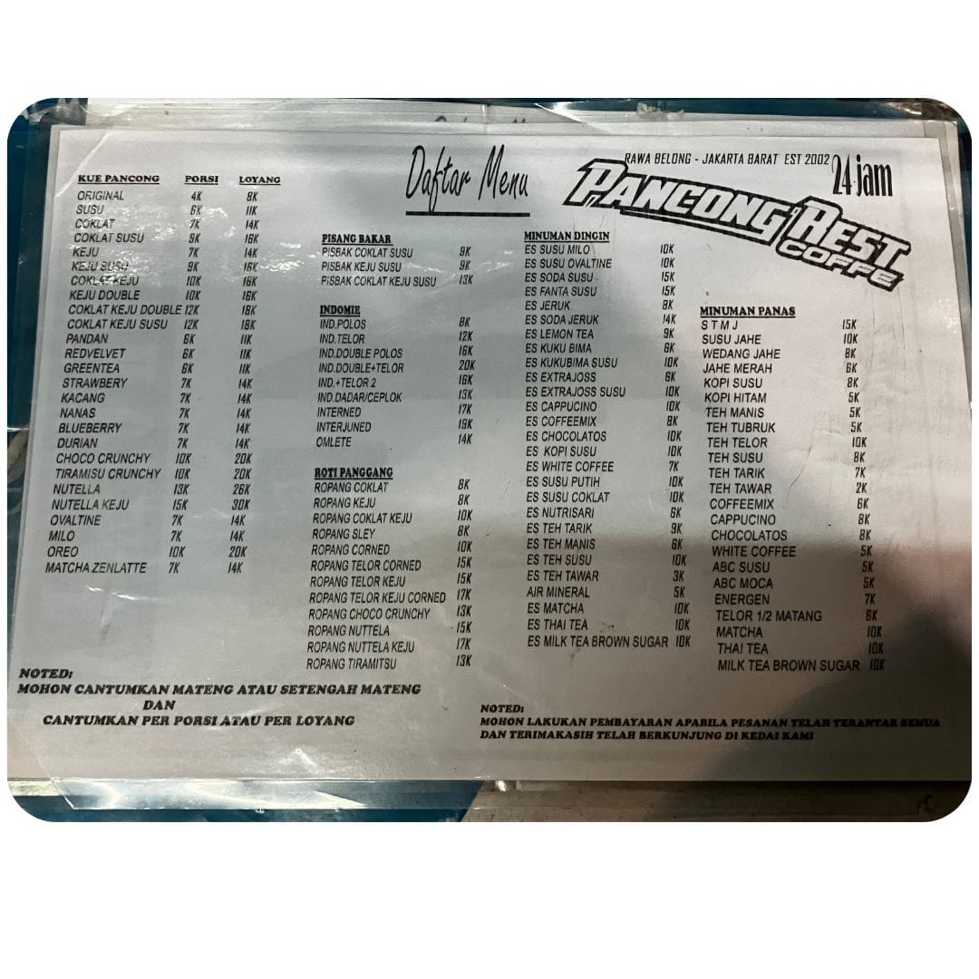 - Pancong Rest Coffee Rawa Belong Jl. Sulaiman No. 10, RT.10/RW.3, Kebon Jeruk, Jakarta Barat 12130, DKI Jakarta, Indonesia Lokasi berada dekat dengan Pasar Bunga Rawa Belong (Pasar Kembang Rawa Belong).