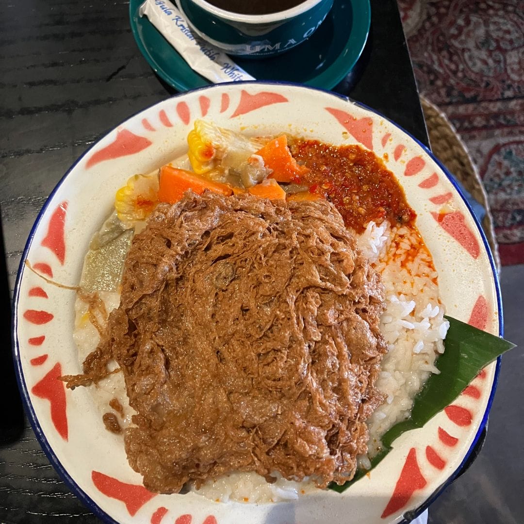 Menu yang kupilih super sederhana: americano dan pisang goreng. Rasa americanonya bersih dan ringan—pas buat nemenin ngetik lama. Pisang gorengnya unik, porsinya generous sampai-sampai aku skip makan siang karena kekenyangan. Sorenya lanjut comfort food: telur dadar + sayur lodeh. Ini highlight-nya. Lodehnya juara—kaya rempah, gurih dalam, lalu disikat sambal yang langsung memanggil memori masakan Sunda di warung favorit. Telur dadarnya super duper crunchy di pinggir, tetap moist di tengah—worth it abis untuk penganan ringan yang berubah jadi “makan beneran”.